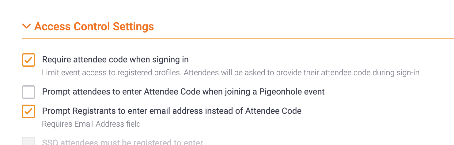 - If the Prompt Registrants to enter email address instead of Attendee Code box is not checked, users will not be able to sign in.