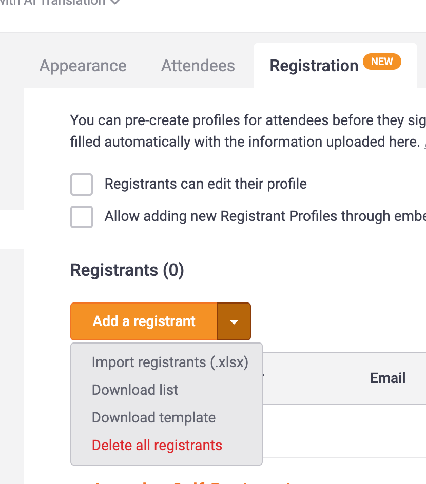 - Next, you’ll have to pre-fill your list of selected attendees. You can add them by uploading a list with their email address using Import registrants, or add them through clicking Add a registrant.