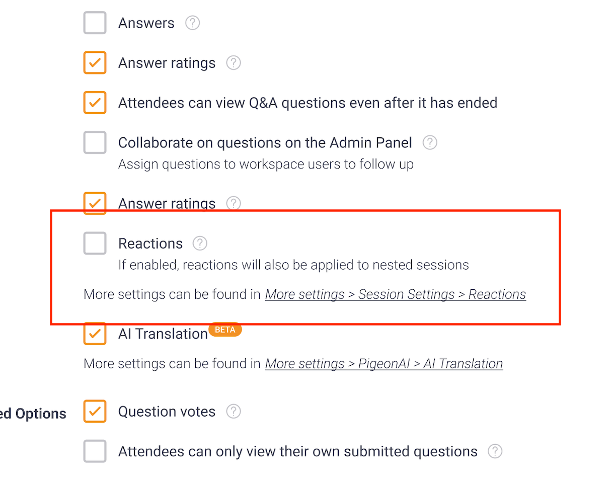 Go to the parent session that you would like to enable Reactions in, and check Reactions in session settings.