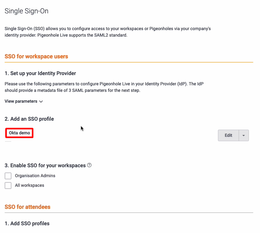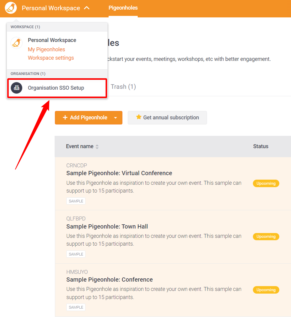 As an Organisation Admin, you can set up and configure an Organisation Workspace SSO. This will allow you to manage the authentication and access control for multiple users within an organisation. For example, the SSO can simplify the login process by allowing the users to sign in once and access multiple applications (including Pigeonhole Live) without the need to enter the login credentials again.