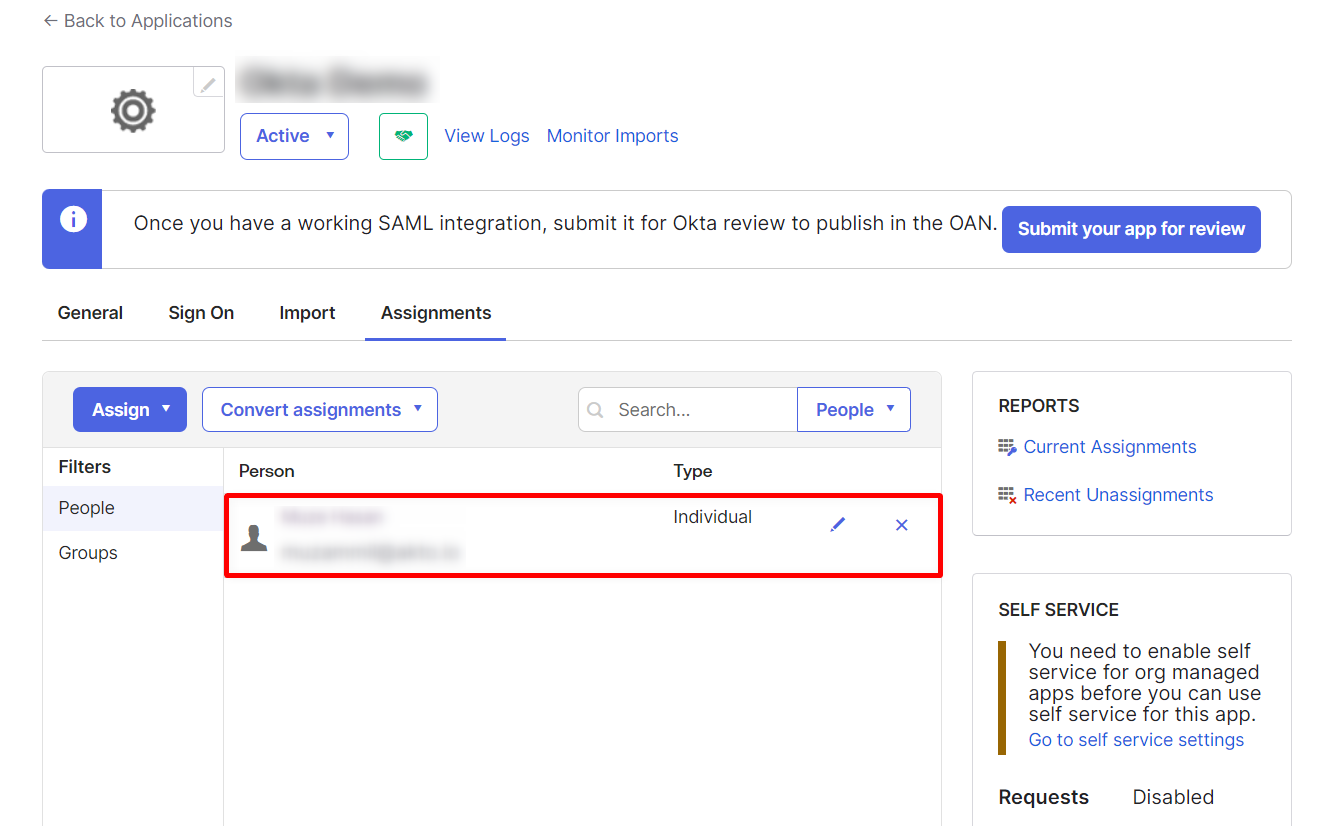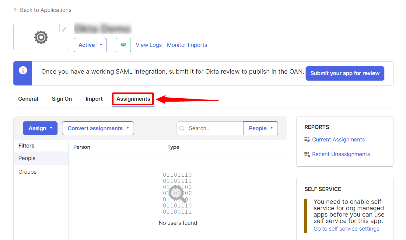 Step 2: Select your created App Integration and click on the Assignments tab.