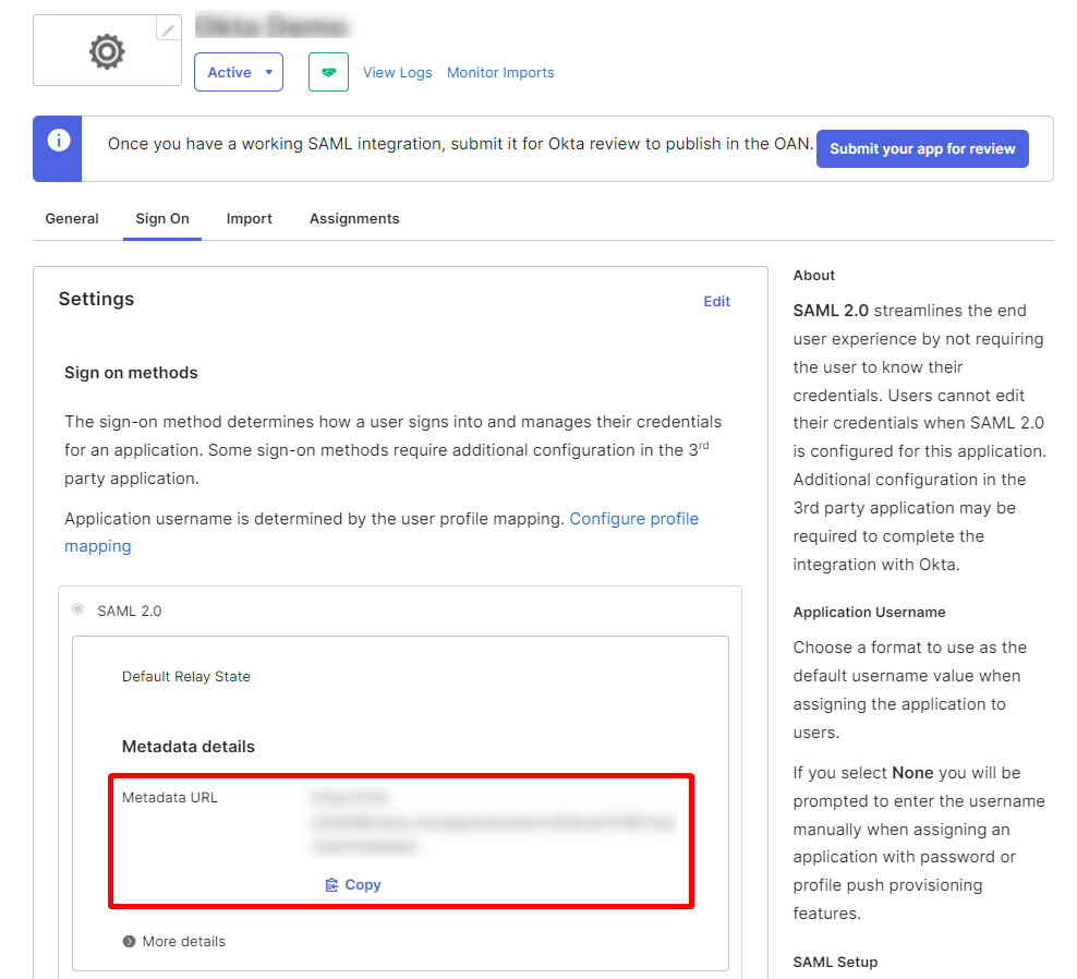 Step 1: Locate the Metadata details section to copy the Metadata URL.