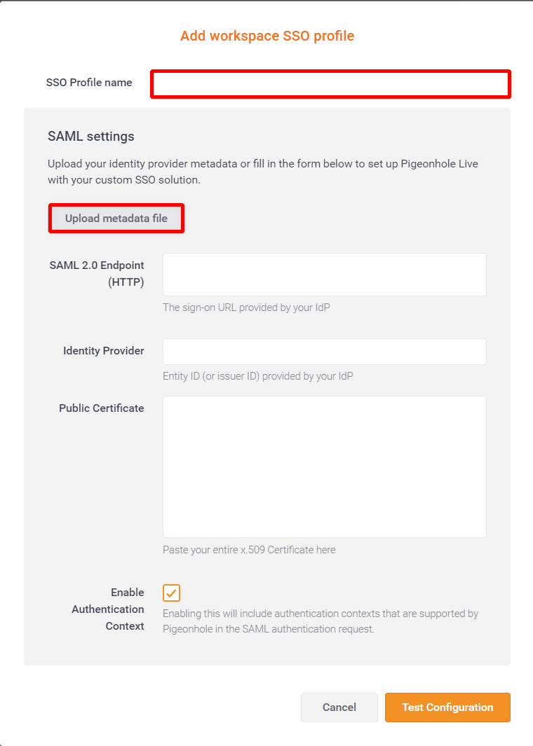 Step 2: A modal window will appear on the screen, where you must enter the SSO Profile name and upload the IdP metadata file.