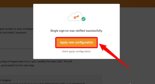 You will be again redirected to Pigeonhole Live with a Single sign-on configuration message where you need to click on the Apply new configuration button to add the Workspace Okta SSO.