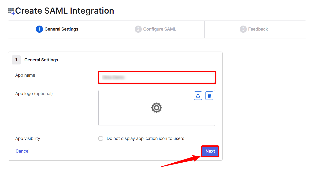 Enter the general information for the SAML integration like the app name and click on the Next button.