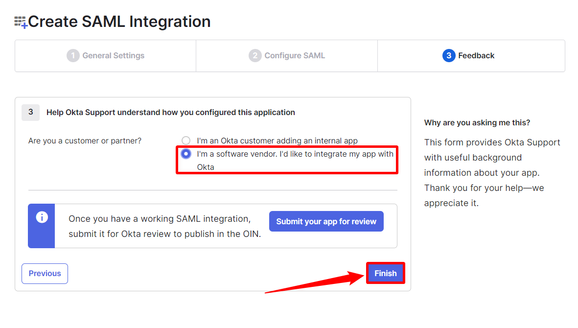 Provide Okta support with useful background information about your application. Check the option “I’m a software vendor. I’d like to integrate my app with Okta” and click on the Finish button to complete the SAML Integration.