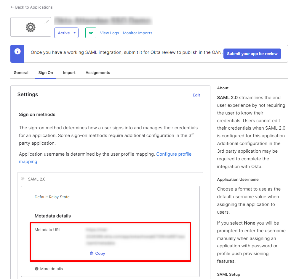 Step 1: Locate the Metadata details section to copy the Metadata URL.