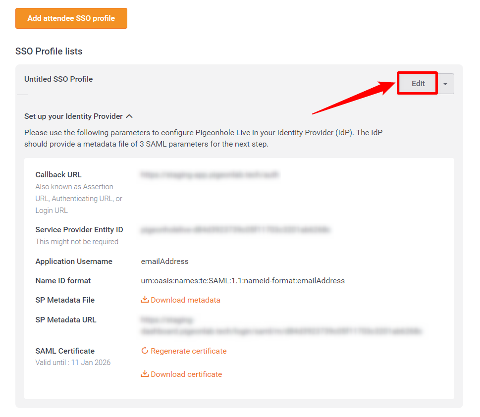 Step 1: From the Single Sign-On Page, click on the Edit button of your Attendee SSO profile.