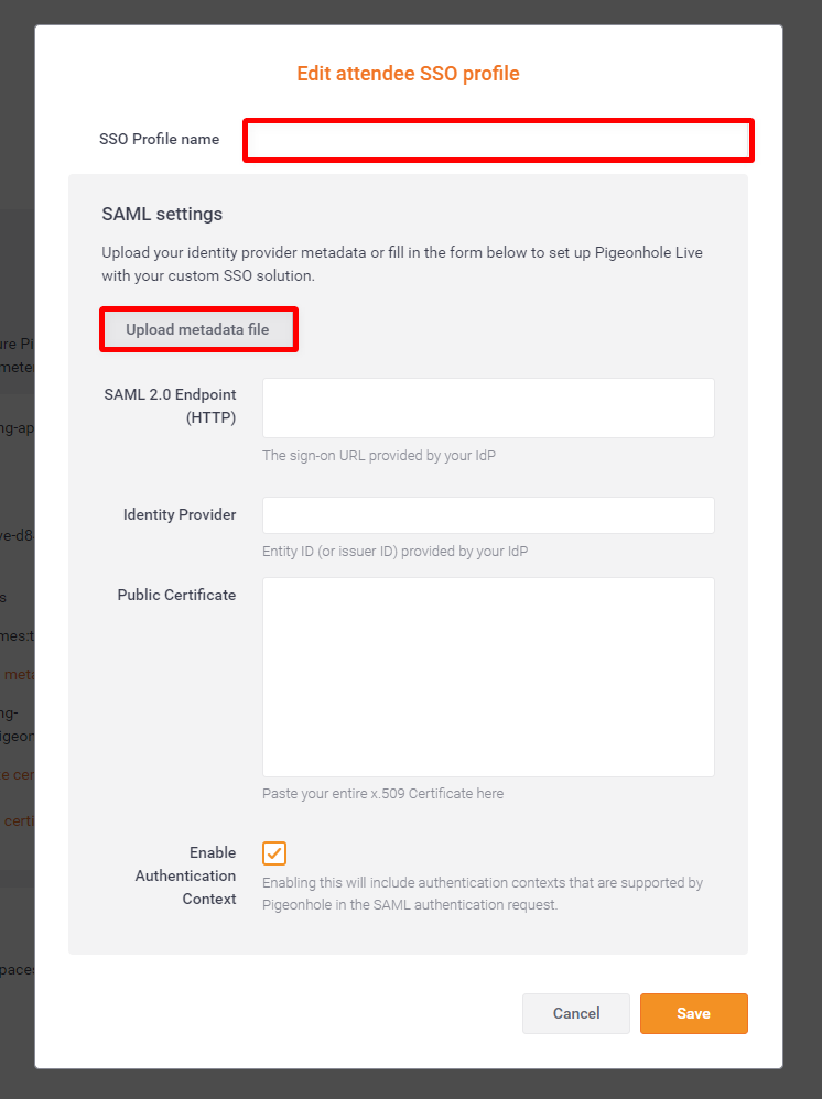 Step 2: A modal window will appear on the screen, where you must enter the Attendee SSO Profile name and upload the IdP metadata file.