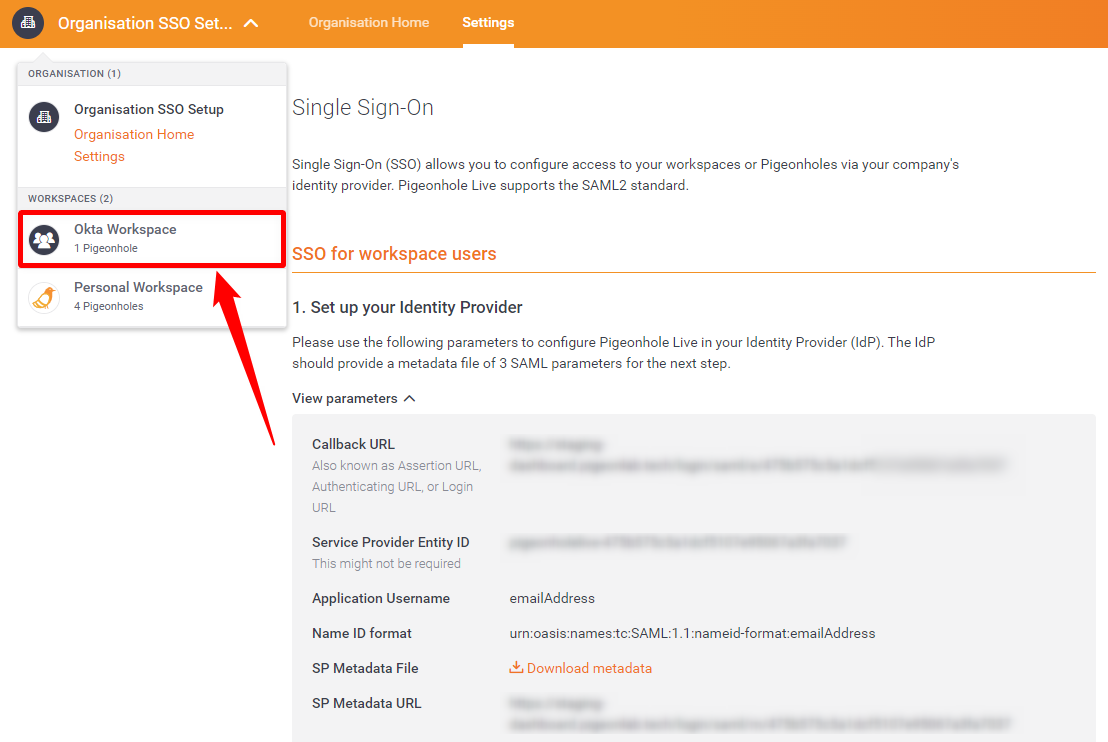 Step 4: Select the Single Sign-On option from the Organisation Settings to configure access to your workspace via the company‘s identity provider (Okta).