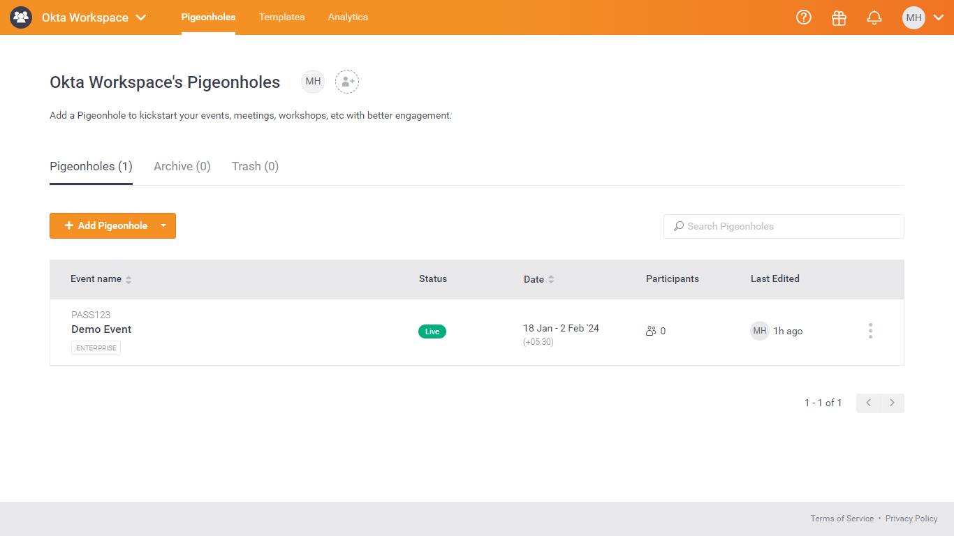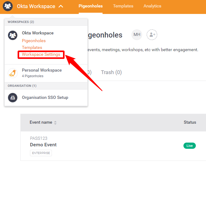 Step 6: Select the Pigeonholes tab from the top navigation bar and this will take you to the Pigeonhole page where you need to set up an Event which will apply the saved SSO configuration for the attendee.