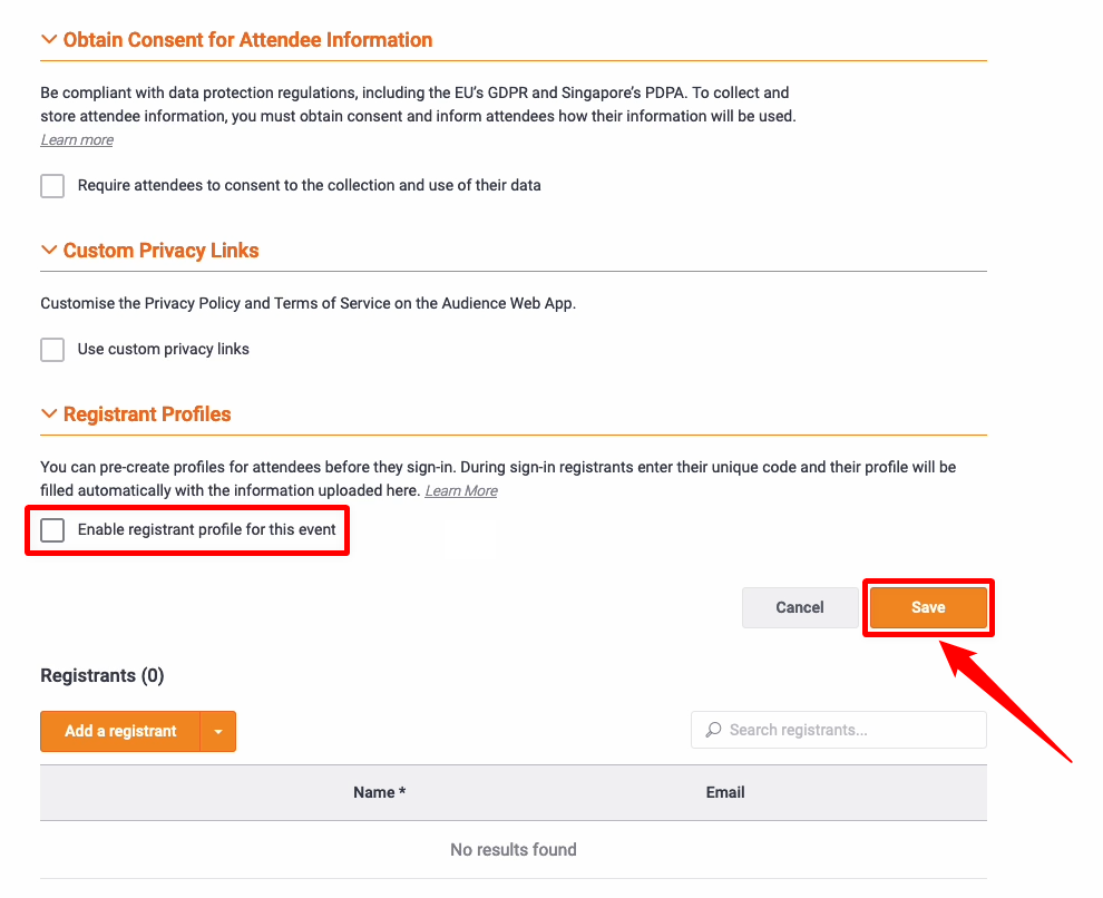Step 8: Navigate to the “Registrant Profiles” section, uncheck the Enable registrant profile for this event option and click on the Save button.