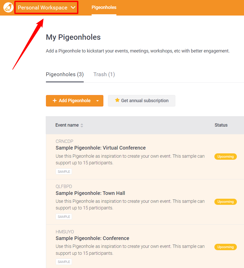 Step 1: Log in to your Pigeonhole Live account to access its dashboard. Click on your Workspace selection list from the top-left corner of the interface.