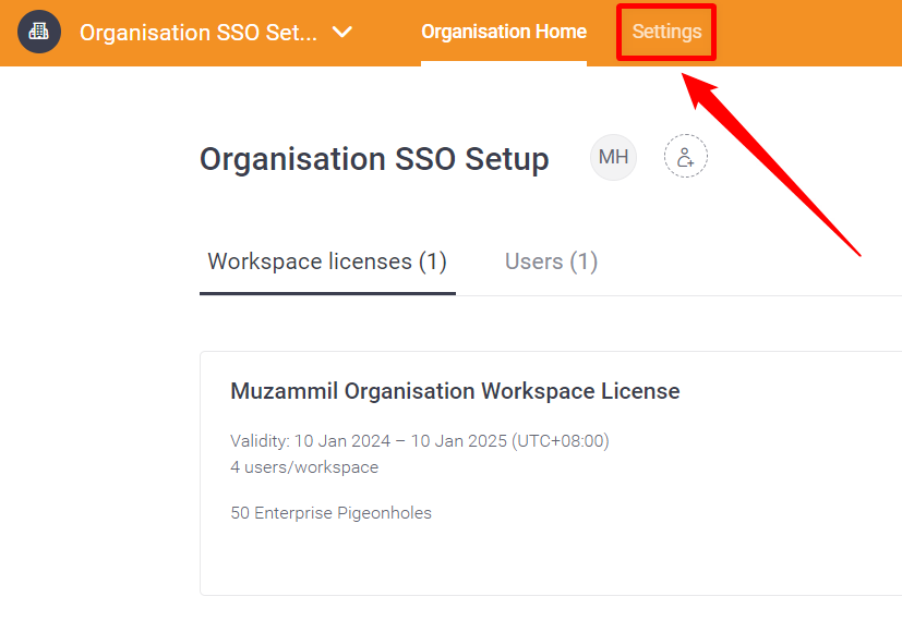 Step 3: Click on the Settings button from the top navigation bar to configure the organisation's Single Sign-On setup.