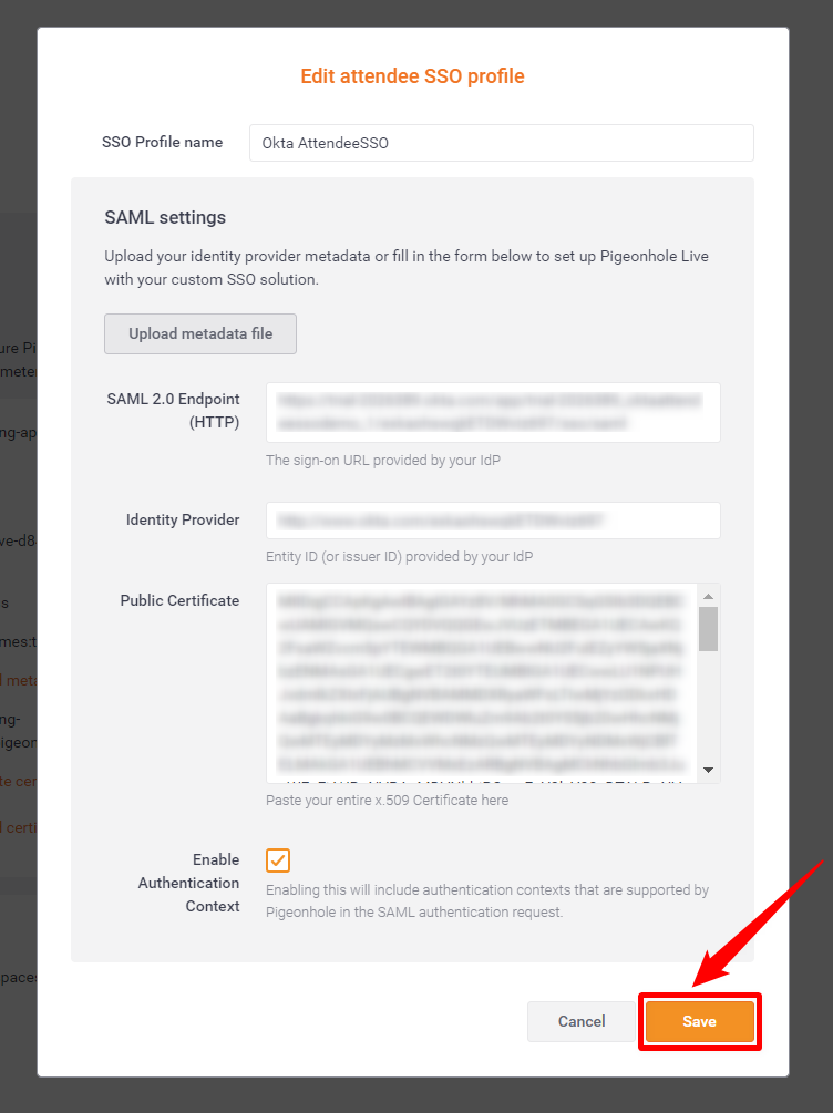 After creating an application in Okta, you will need to edit an Attendee SSO profile which involves modifying the SAML settings associated with the organisation SSO from Pigeonhole Live.