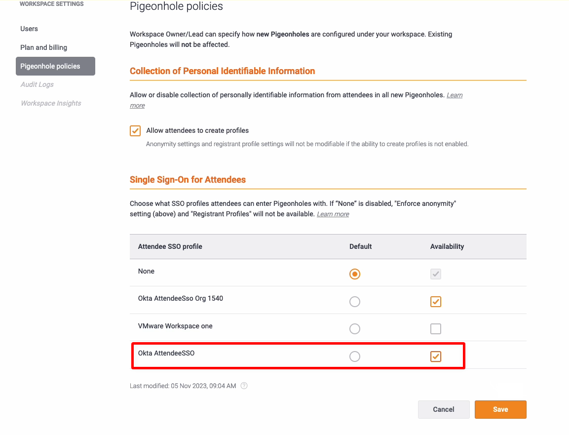Manage the attendee SSO profiles for your workspaces from Pigeonhole Live events using SSO configuration.