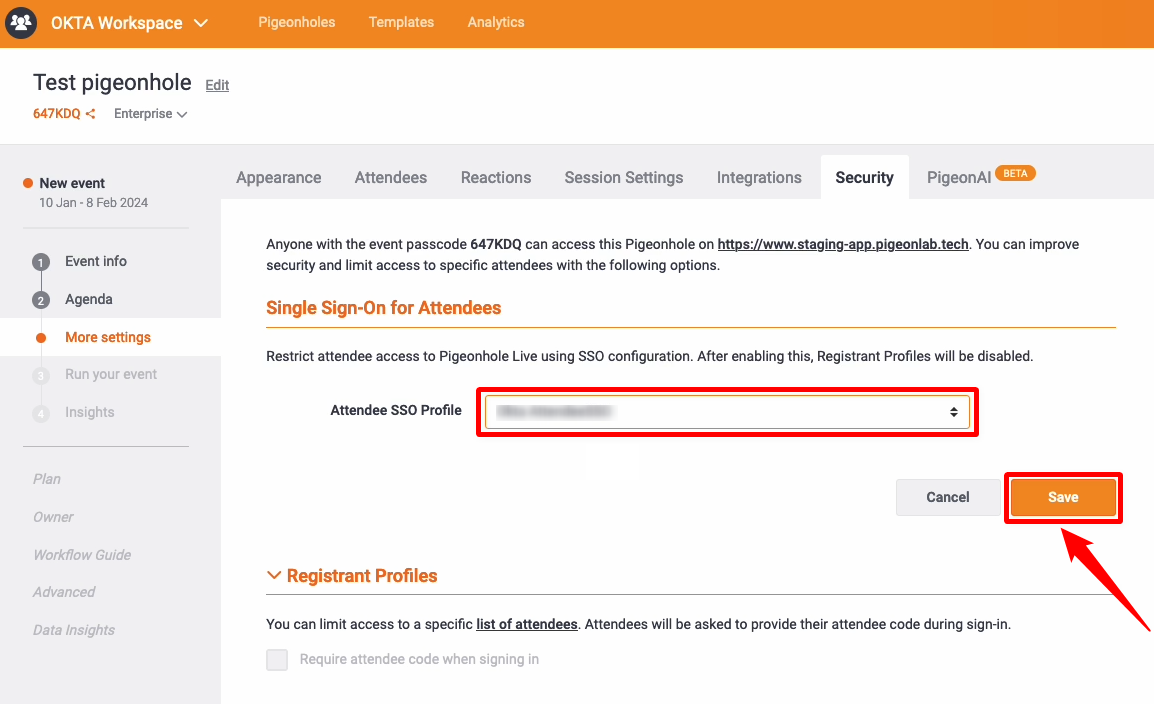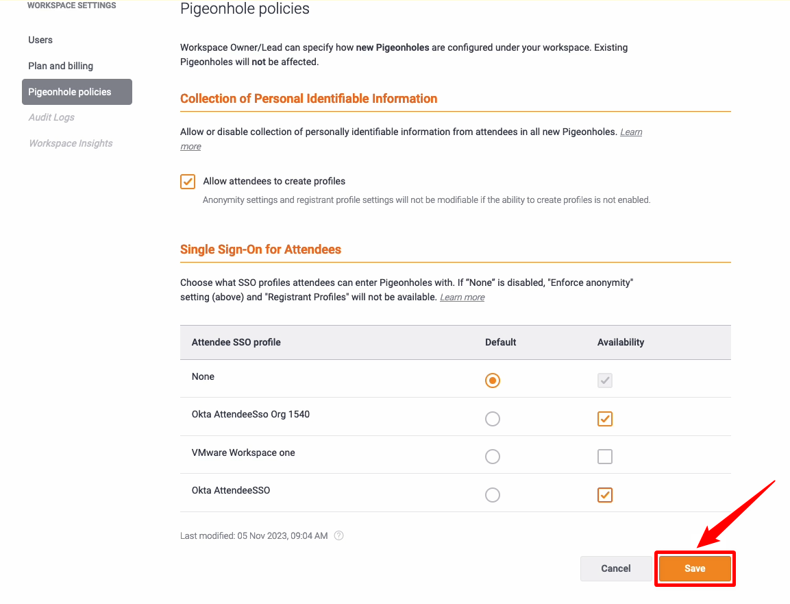 Step 10: Select the Attendee SSO profile which you added for your workspace from organisation settings and click on the Save button.