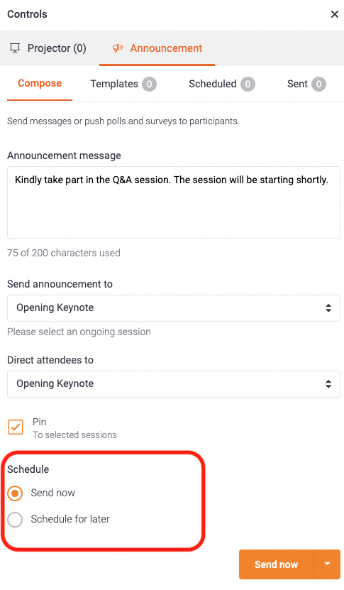 6. Under the Schedule section, select Send now (to send the announcement instantly) or Schedule for later (to schedule the announcement for a later time).