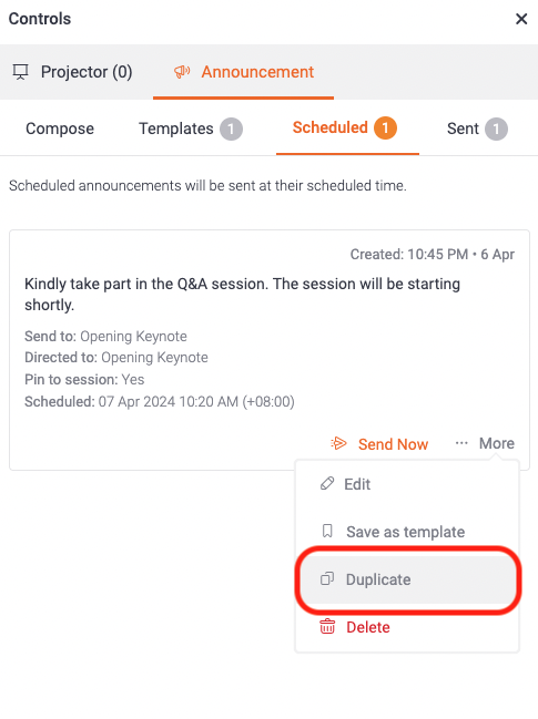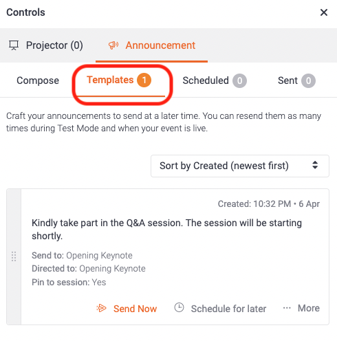 Announcement templates are great when you need to send the same announcement to multiple sessions. Instead of creating them from scratch, you can create the announcement as a template that you can re-use throughout the event.