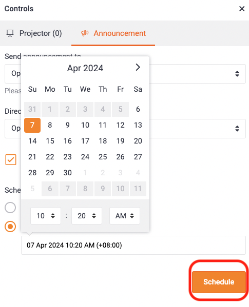2. Then, select the date and time to send the announcement on the pop-up calendar.