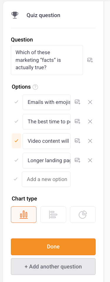 - Select Done. Or, to add another Quiz question, select Add question.