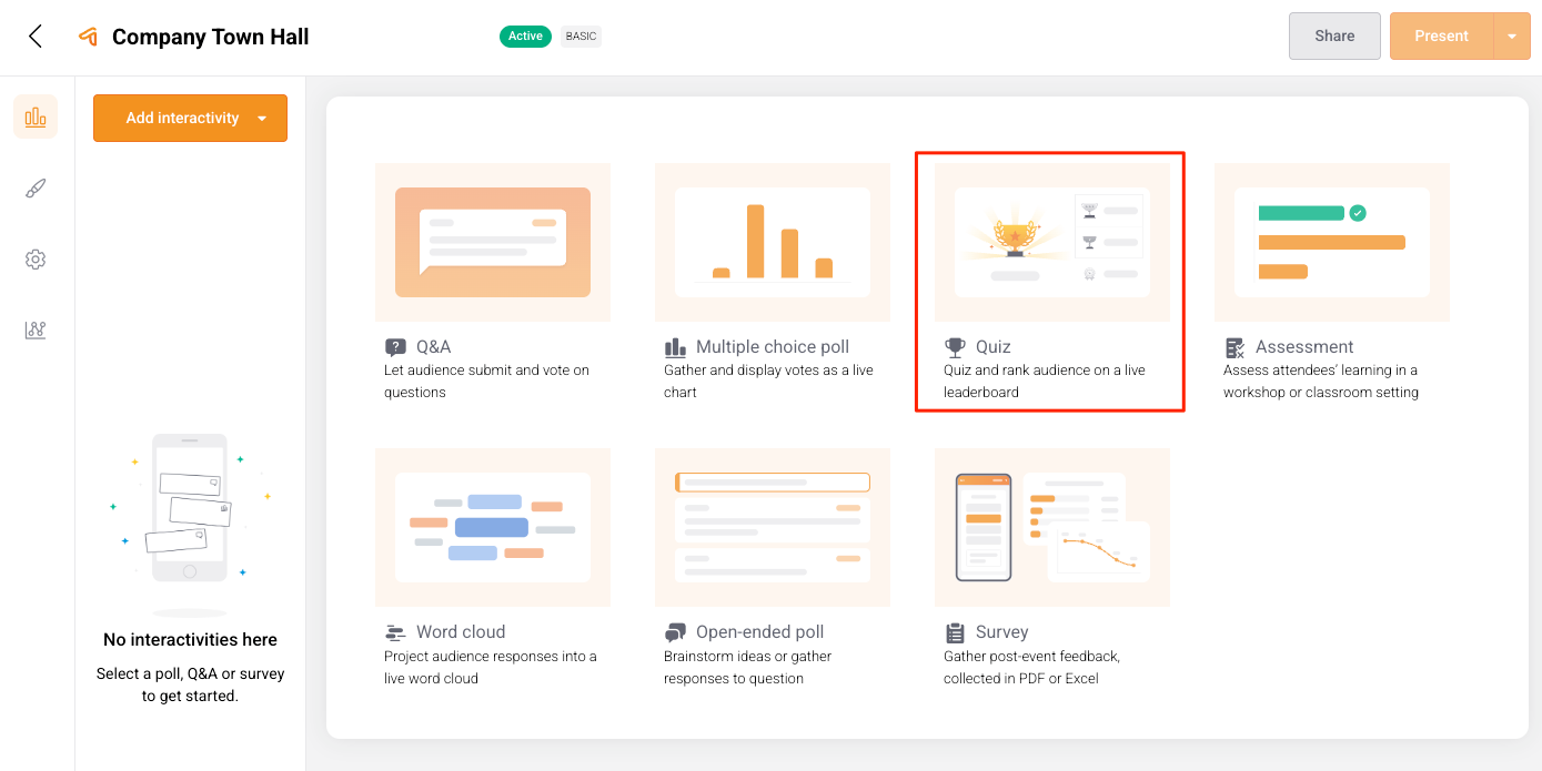 - If the Quiz is the first Interactivity you’re adding to the Presentation, select the Quiz card.