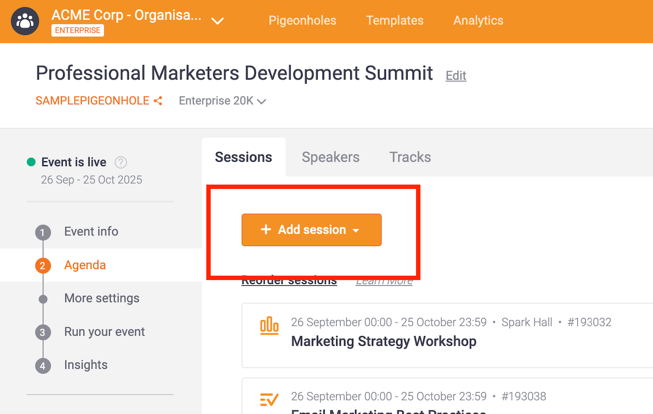 - Speaker: When filled, the speakers for a session will be displayed on the Agenda, and in the session.