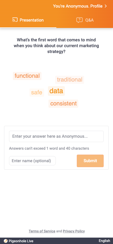 Using the Audience Web App, participants can submit answers and watch the Word Cloud update live.