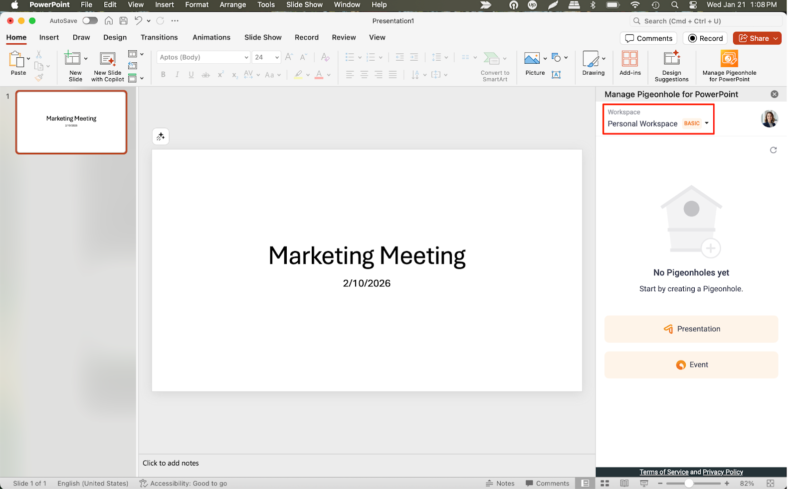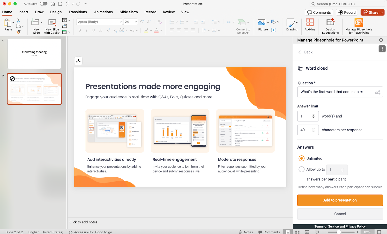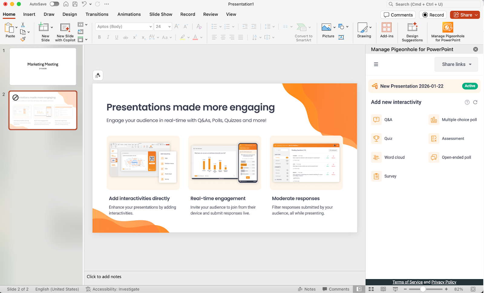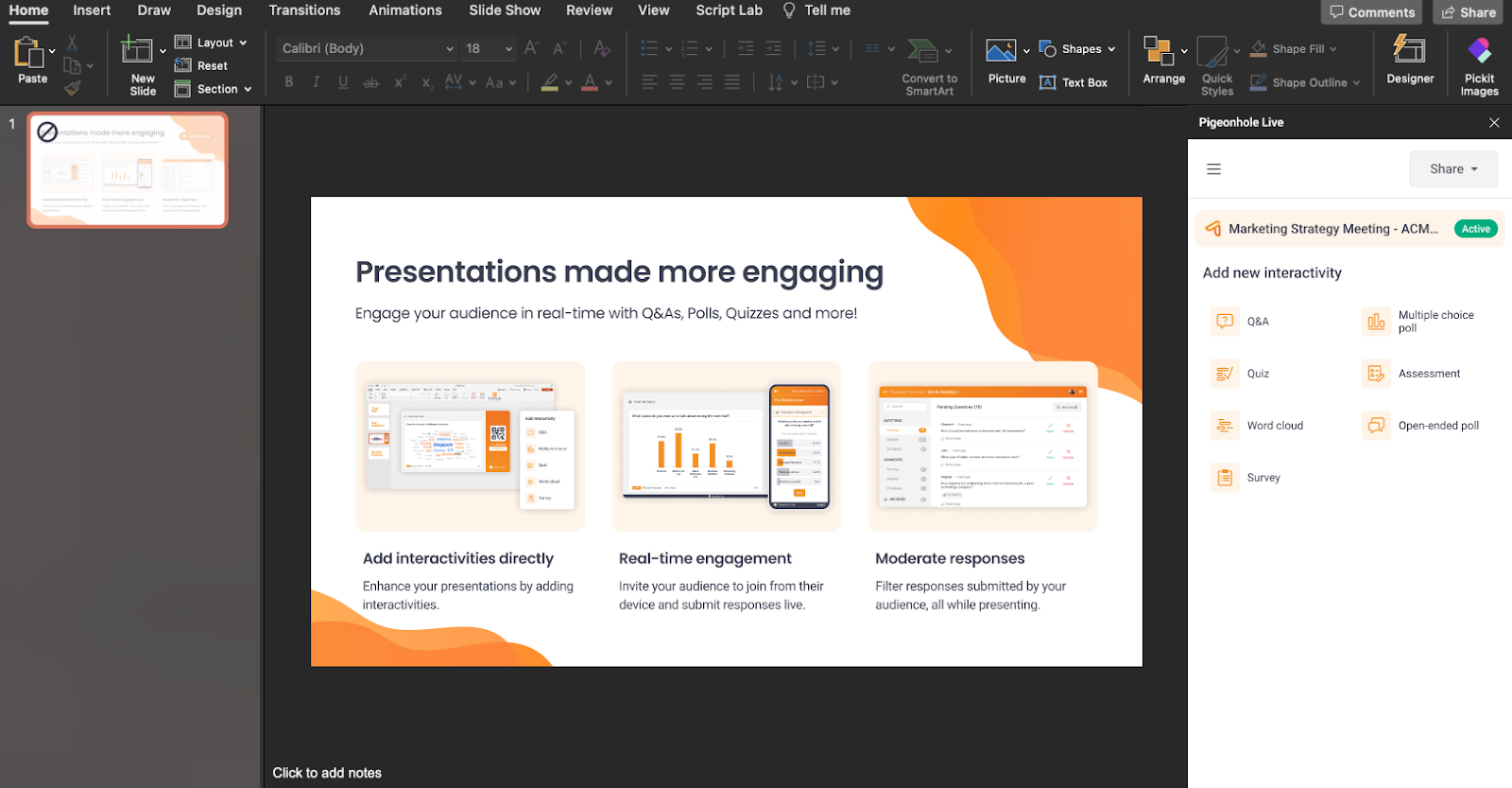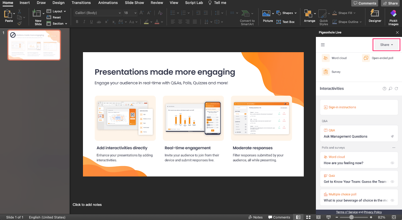 While the Pigeonhole Live Dashboard is often the easiest starting point, you can also create your Presentation Pigeonhole directly from within PowerPoint.