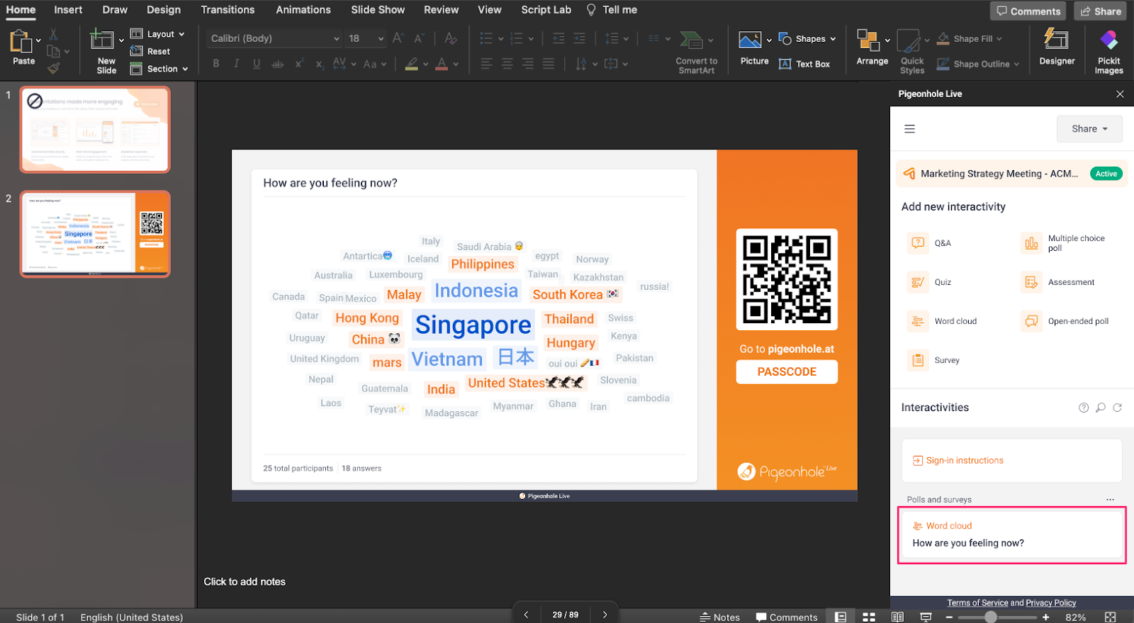 A populated Word cloud slide. The card for the Word cloud Interactivity in the Pigeonhole Live panel is highlighted.