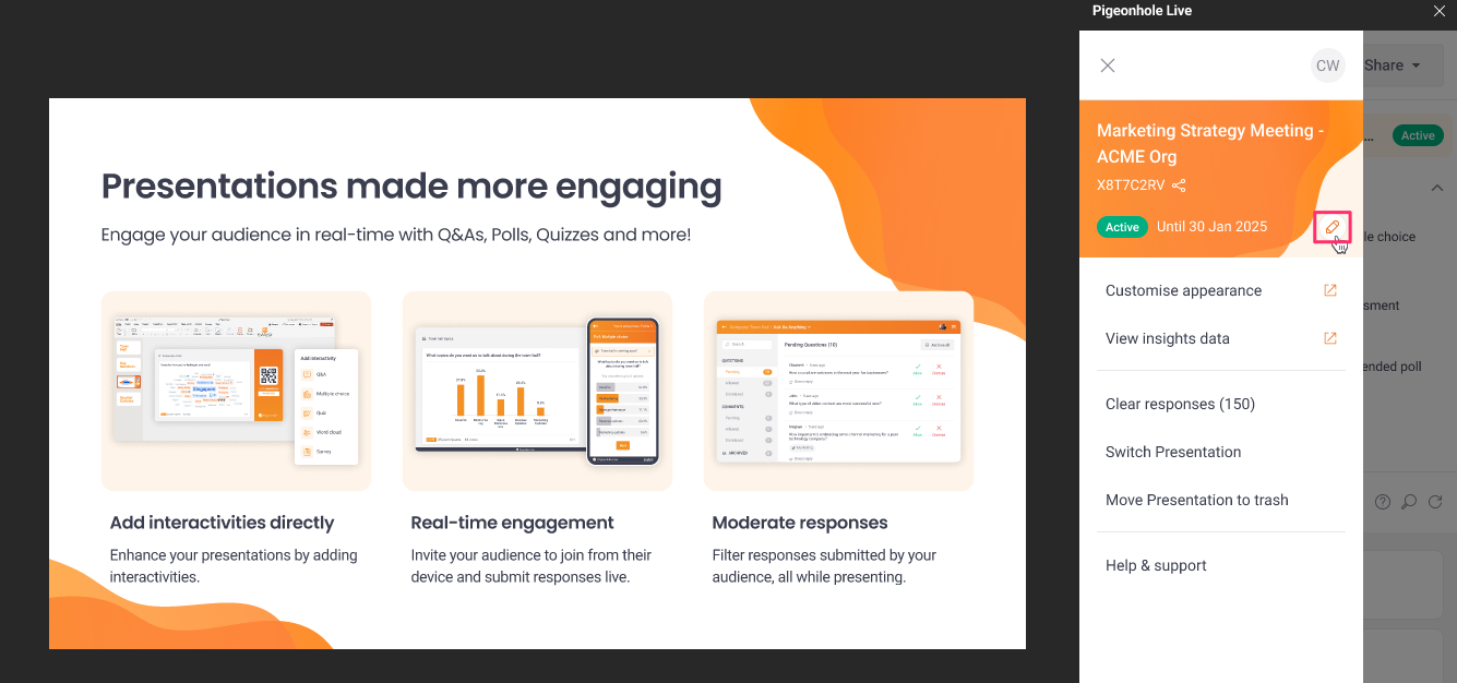 2. To change the Presentation name, Passcode, or End date, select the pencil icon.