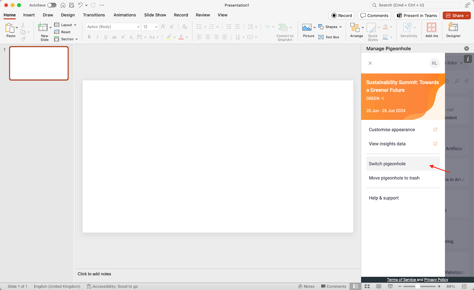 To use a different Pigeonhole for your slides, select Switch pigeonhole.