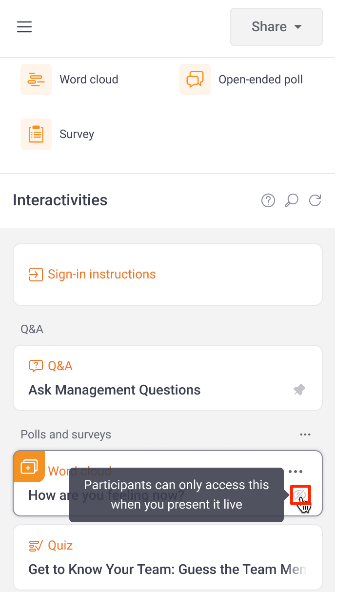 8. (Optional) You can hide one or more interactivities from participants until you present them live. For example, you might hide a Quiz or Assessment.