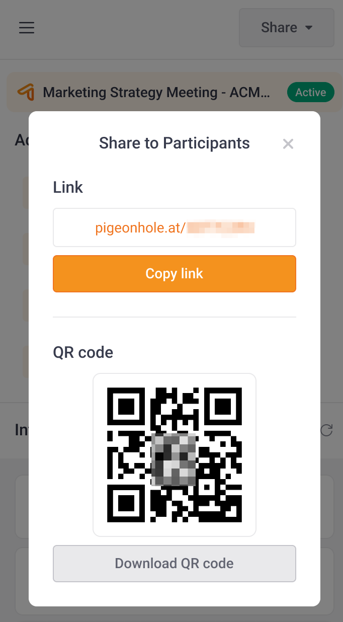 • Share > Invite participants: Displays a link and QR code that open the Presentation Pigeonhole in the Audience Web App.