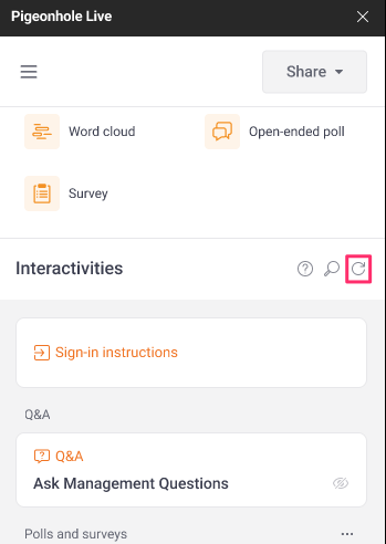 3. Select the Sign-in instructions card in the Pigeonhole Live panel. This adds a slide that has instructions for participants to join through the Audience Web App.