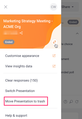 To delete the entire Pigeonhole from the Pigeonhole Live platform, select Move Pigeonhole to trash. You will be prompted to select a new Pigeonhole for the PowerPoint, or redirected to the Pigeonhole Live Dashboard to create a new one.