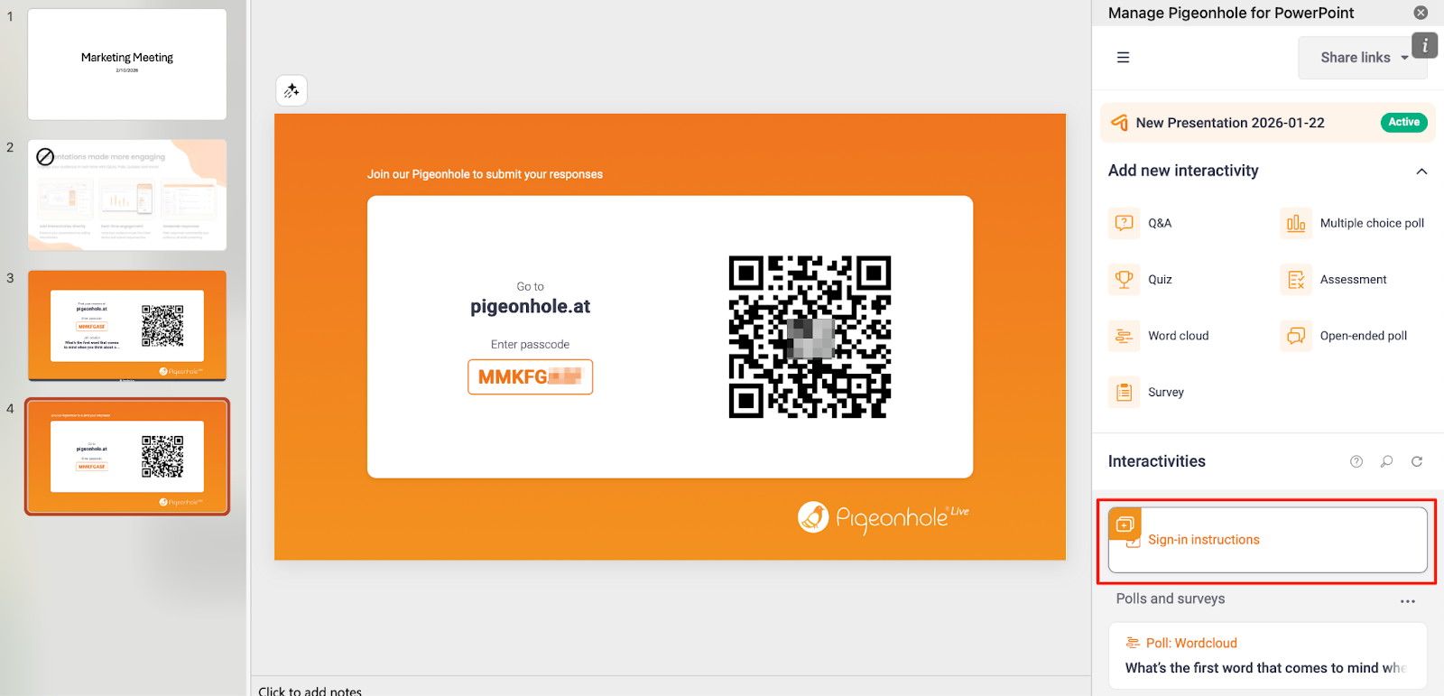 5. In the Pigeonhole Live panel, select the Sign-in instructions card. This adds a slide that has instructions for participants to join through the Audience Web App.