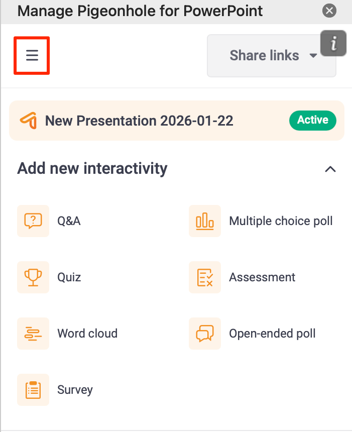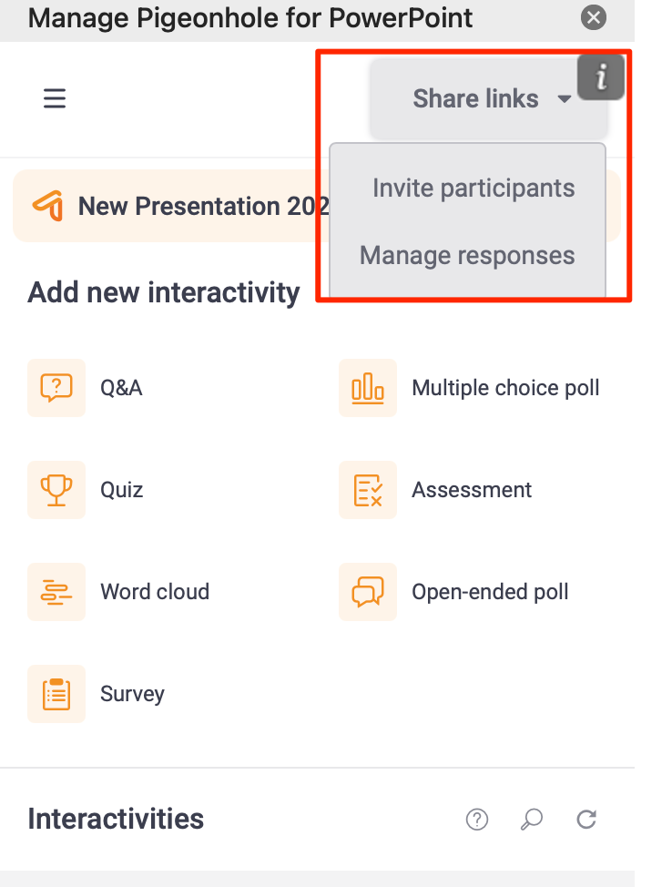1. (Optional) To share the Presentation Pigeonhole, use the Share links menu at the top right.