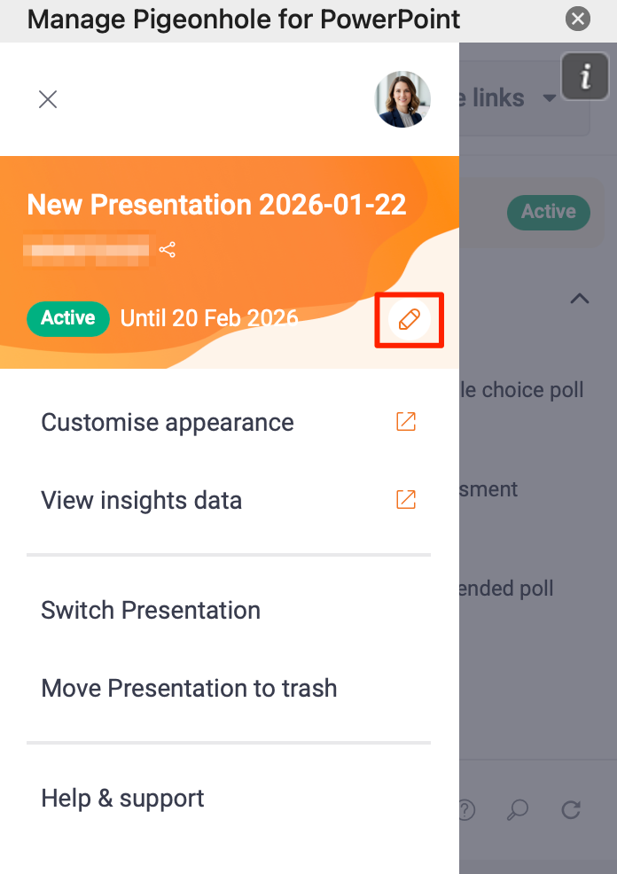 3. You can change the Pigeonhole name, Passcode, or End date. In the window that opens, select the pencil icon that appears when you hover near the title of the Presentation.
