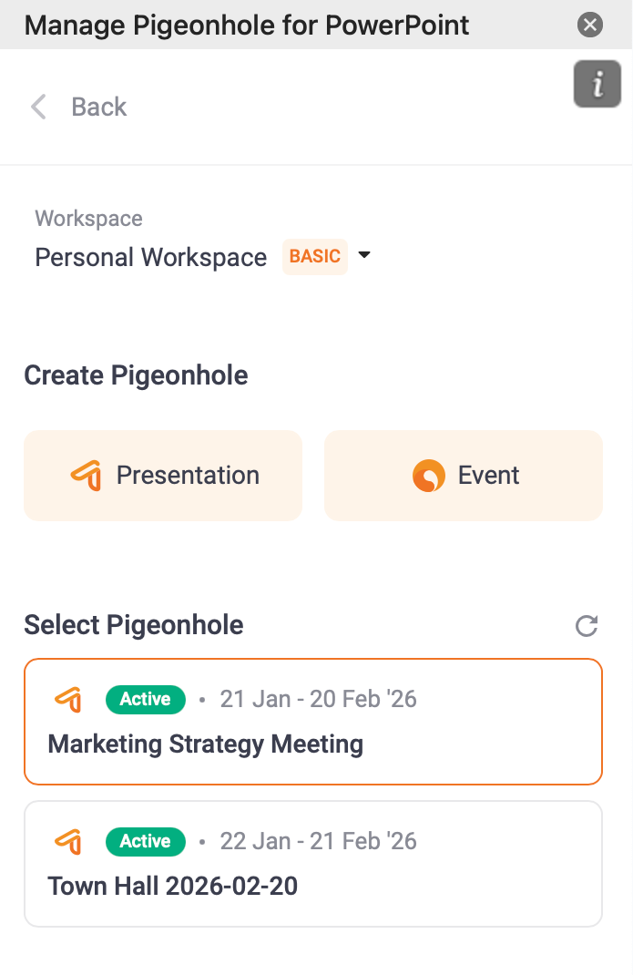 A list of pigeonholes in the current Workspace opens in the Pigeonhole Live panel. Select the Pigeonhole you want to use. Or, select Presentation or Event under Create Pigeonhole. When you select one of these options, you’re redirected to your Workspace to create a new Pigeonhole.