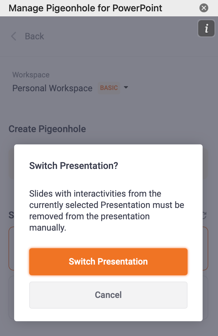 Important: Interactivities you already added to your PowerPoint will not be deleted. Consider deleting them before you switch to the new Pigeonhole. This ensures that audience engagement takes place within a single Pigeonhole, which enables comprehensive data collection and representation in Pigeonhole Insights.