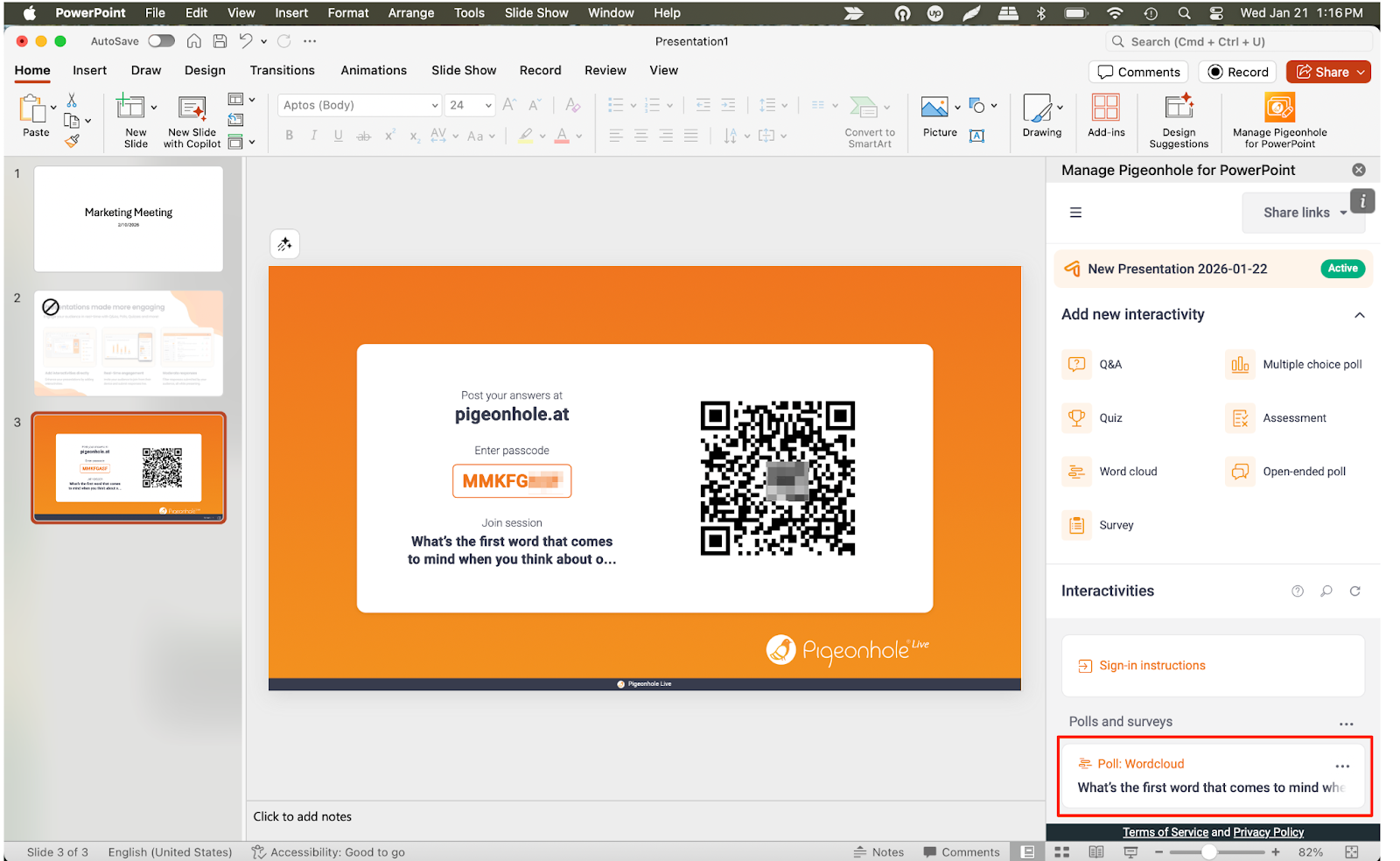 A new Word cloud slide. The card for the Word cloud Interactivity in the Pigeonhole Live panel is highlighted.