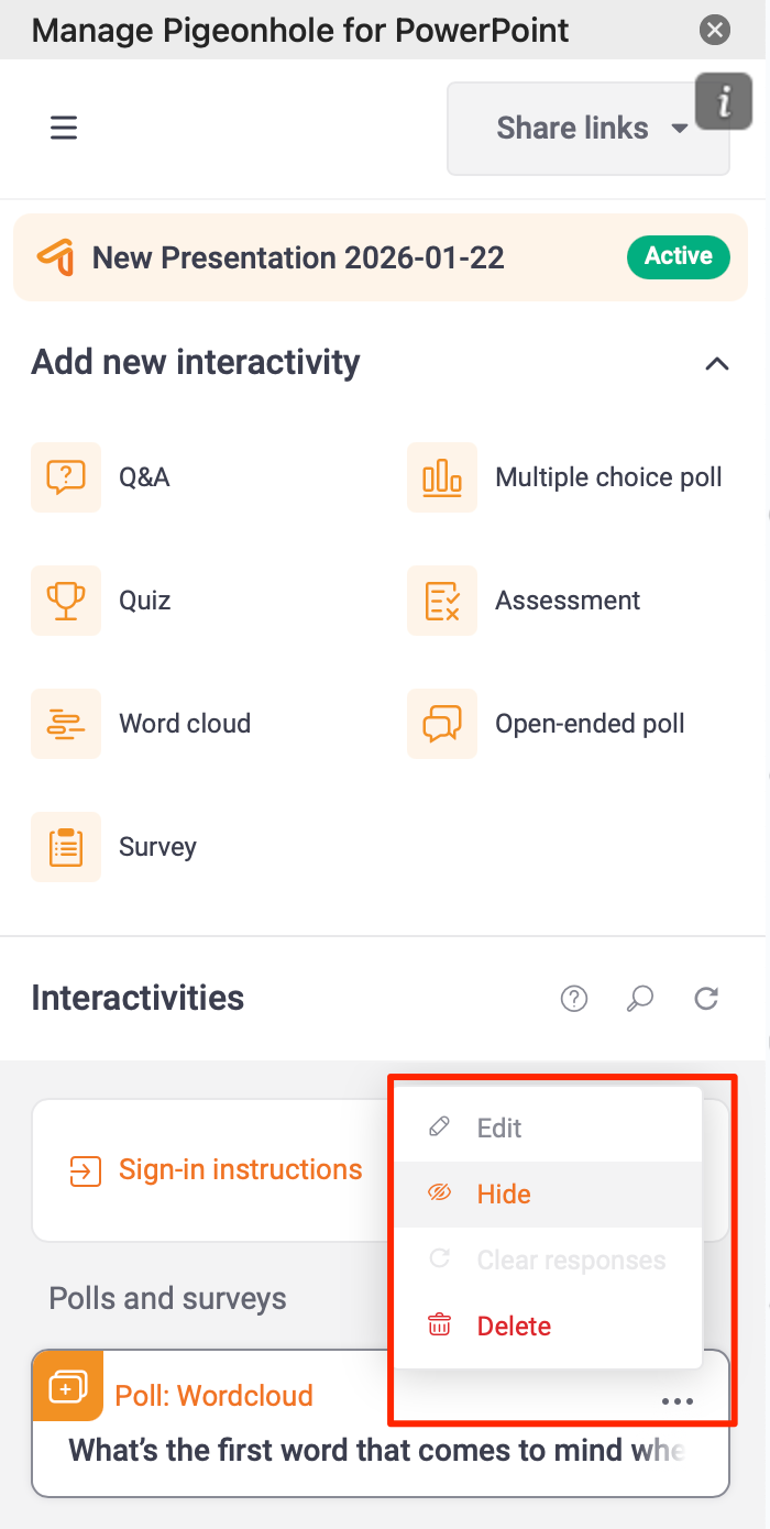Important: If you added interactivities from a Pigeonhole to your PowerPoint, the slides are not automatically deleted. You must delete them from the PowerPoint manually.