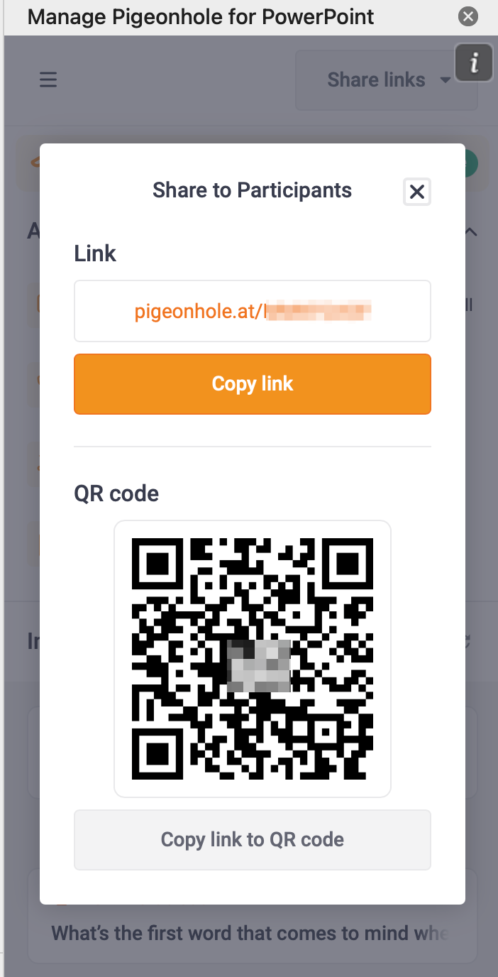 • Share links > Manage responses: Displays a link and QR code that open the Presentation Pigeonhole in the Admin Panel. Use this option to share with a team member who will manage responses and audience engagement while you focus on giving your talk.