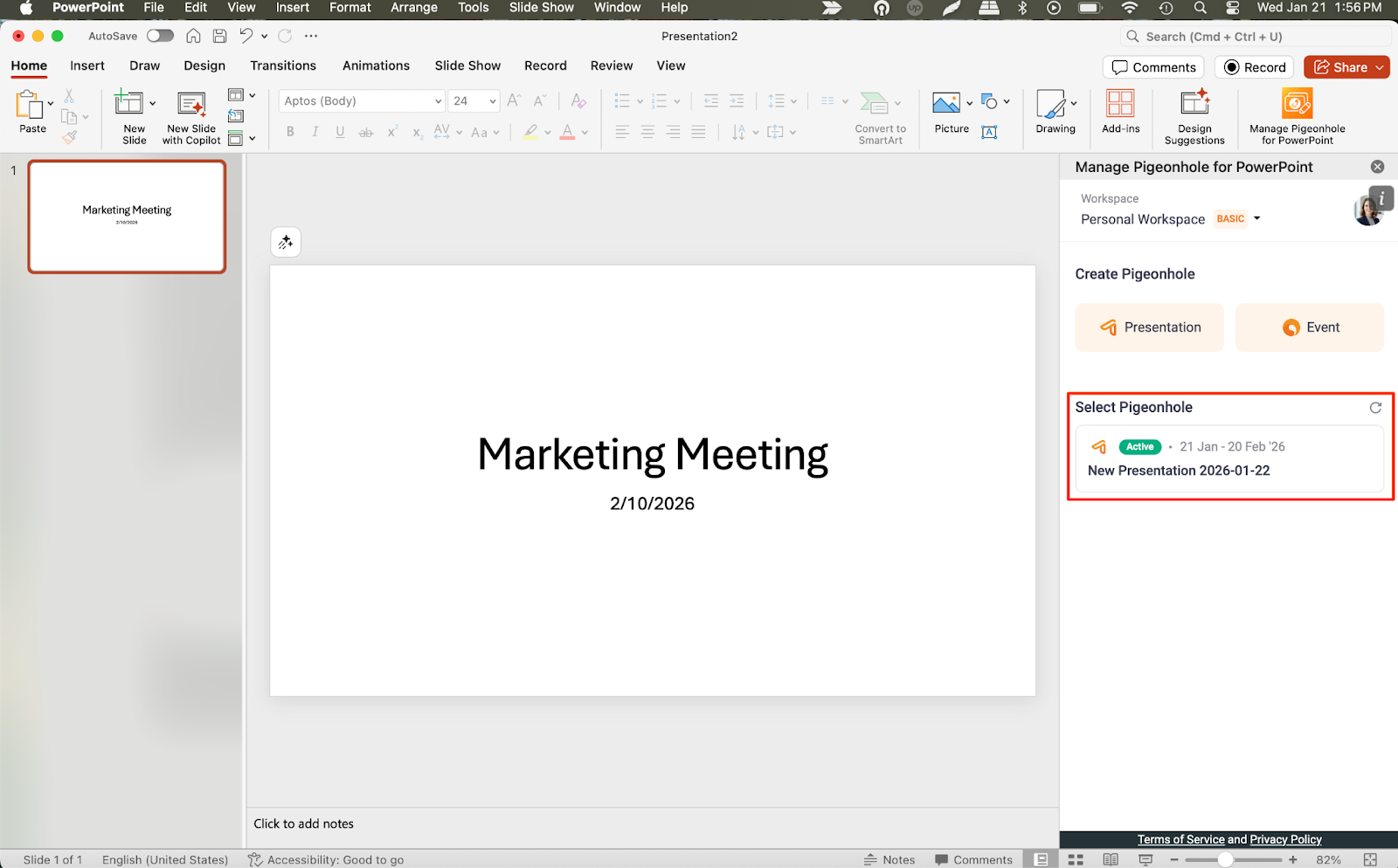 If you already created your Presentation Pigeonhole in the Dashboard, here’s how to add it to your PowerPoint: