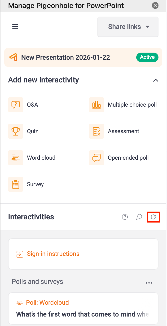 You can sync any changes made on the Dashboard to PowerPoint. From the side panel, select the refresh icon. This icon is available for the list of presentations in a Workspace, and for the list of interactivities in a Presentation.