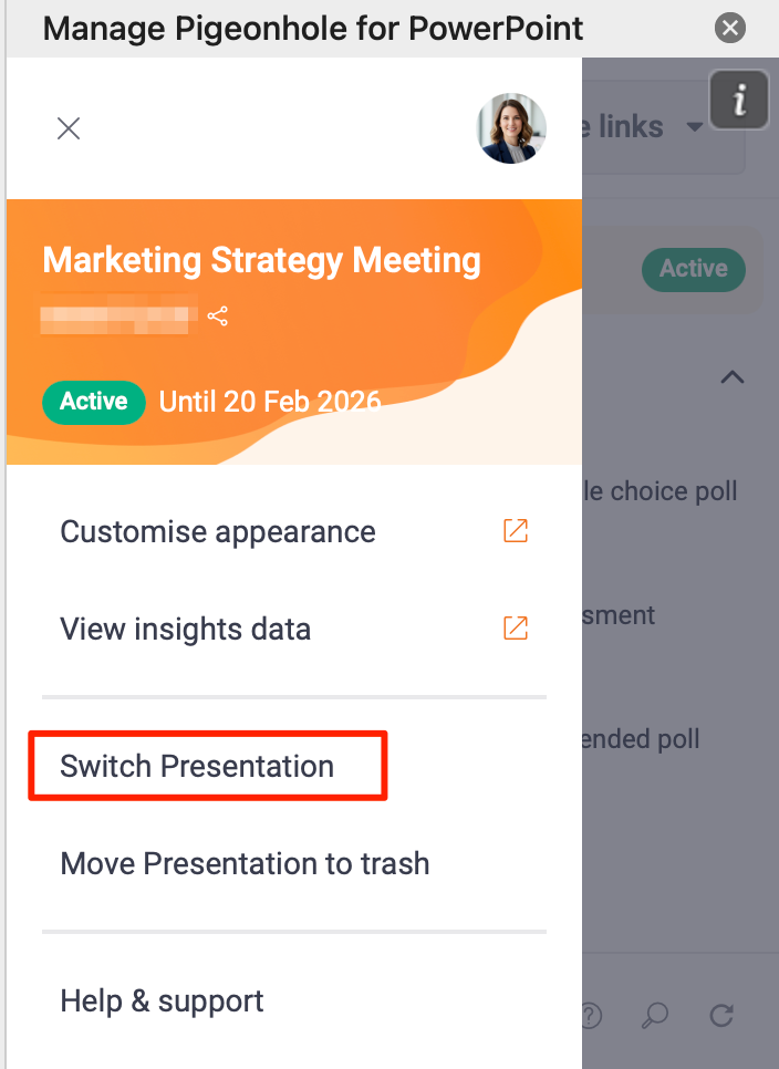 To use a different Pigeonhole for your slides, select Switch Presentation