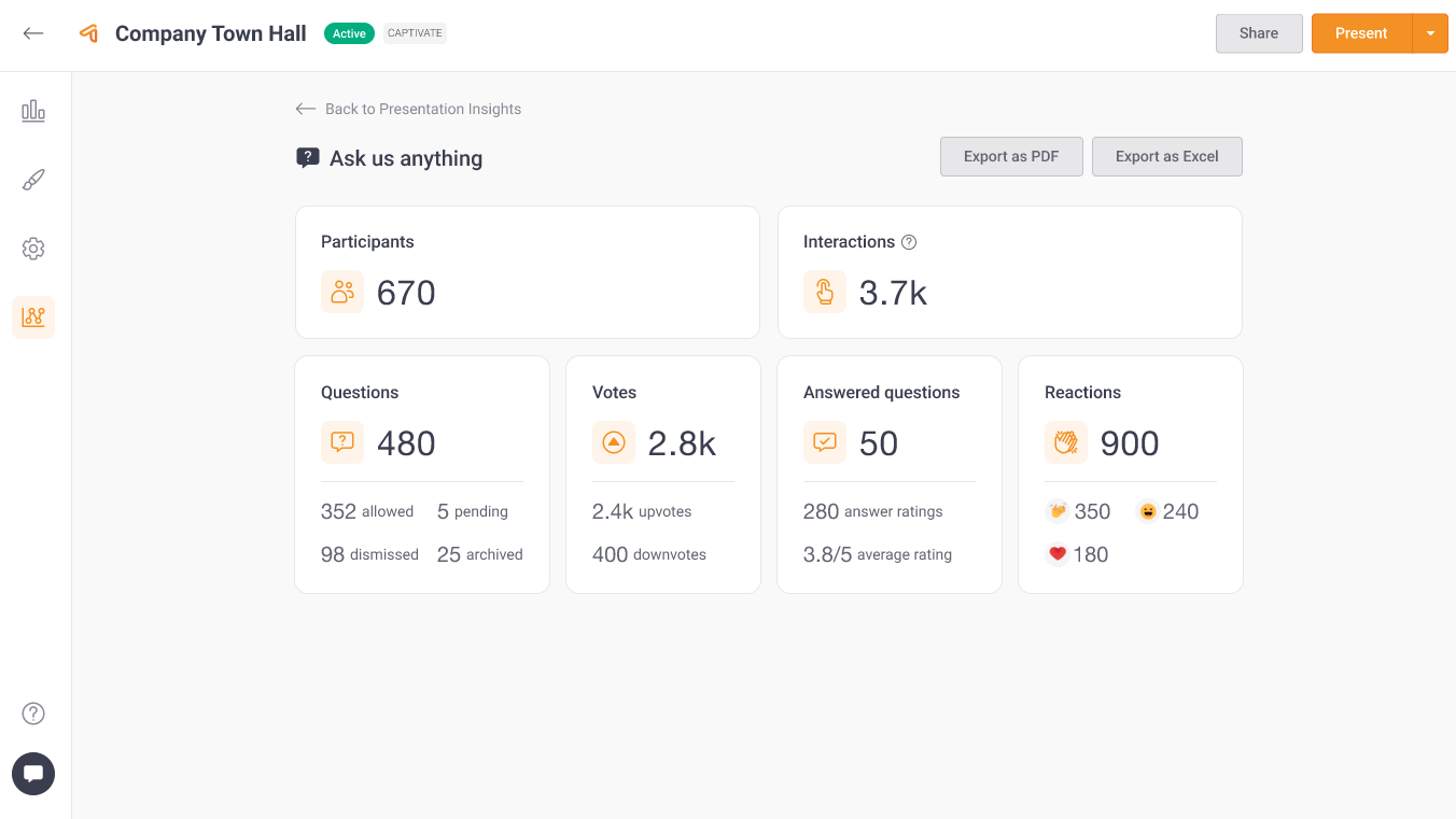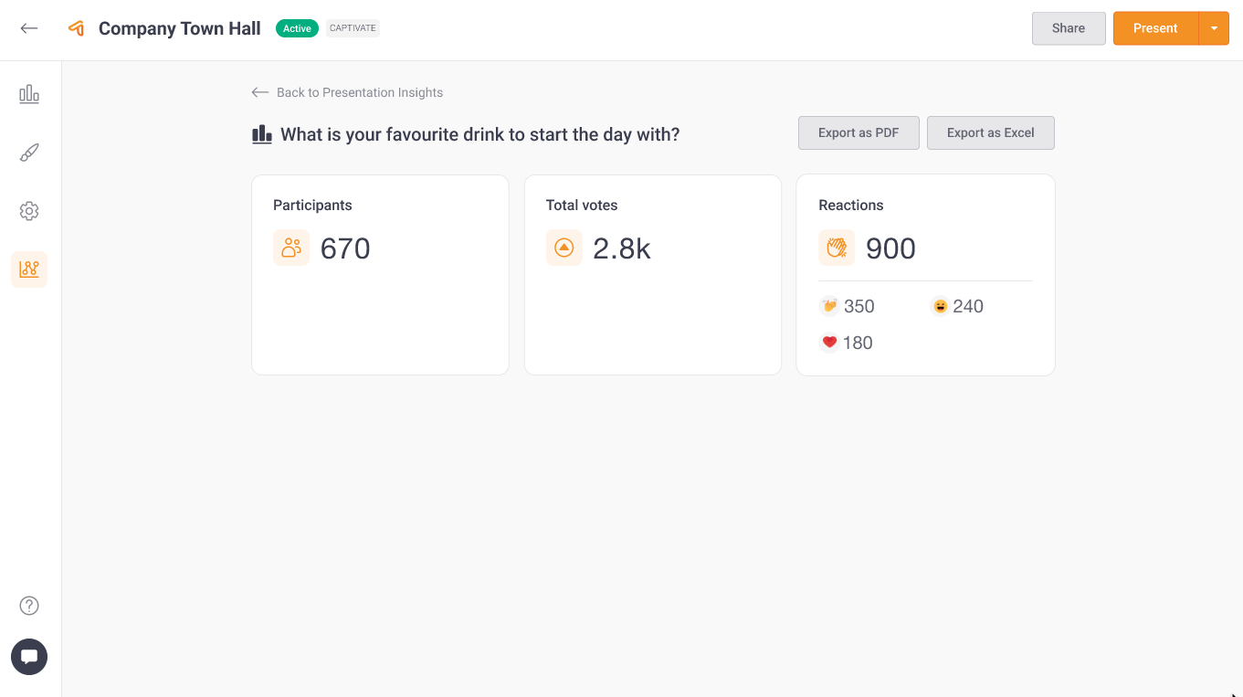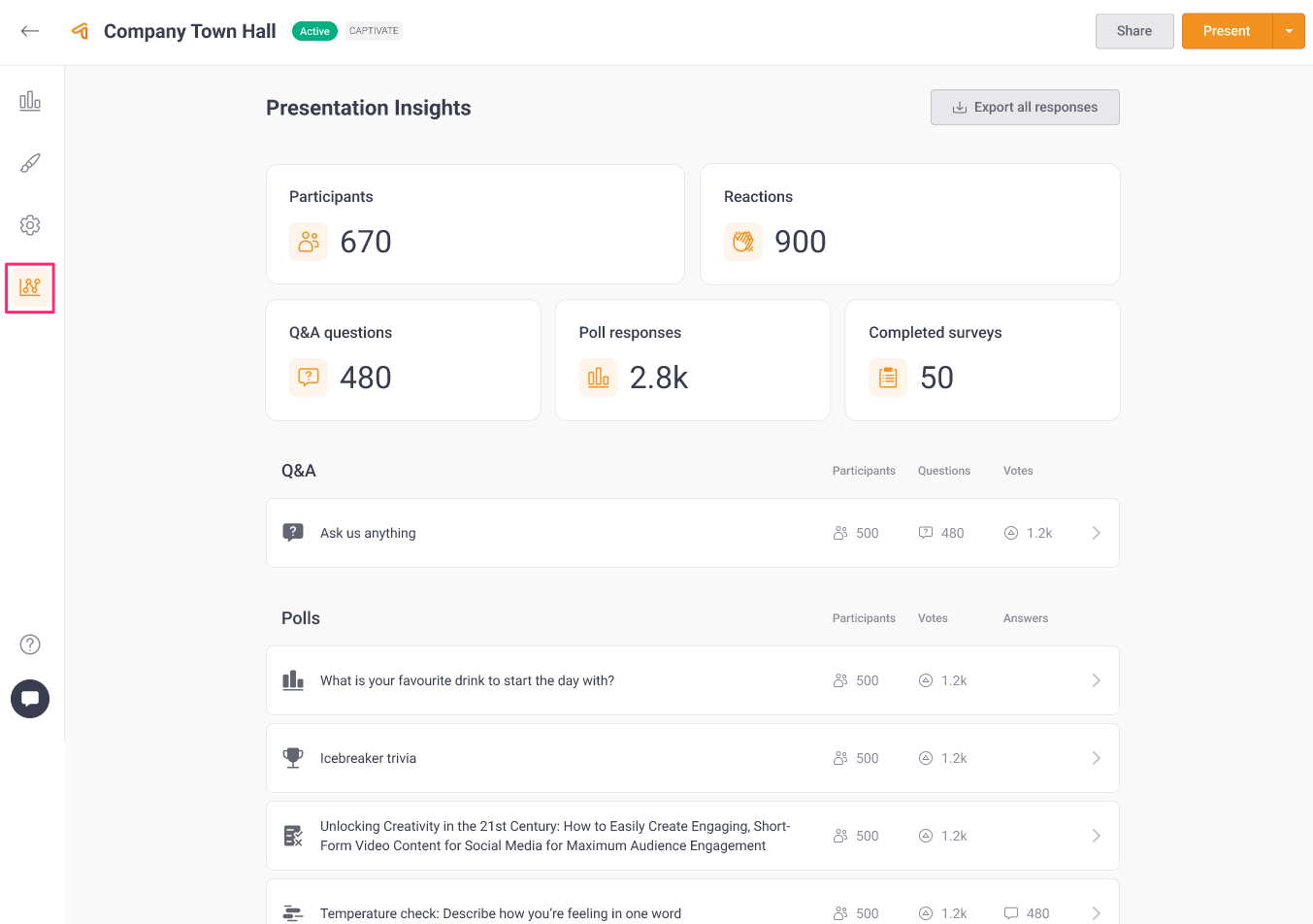 The Presentation Insights page provides analytics for all your presentations. You can track audience engagement in real time or review the data afterward to measure participation and understand your audience.