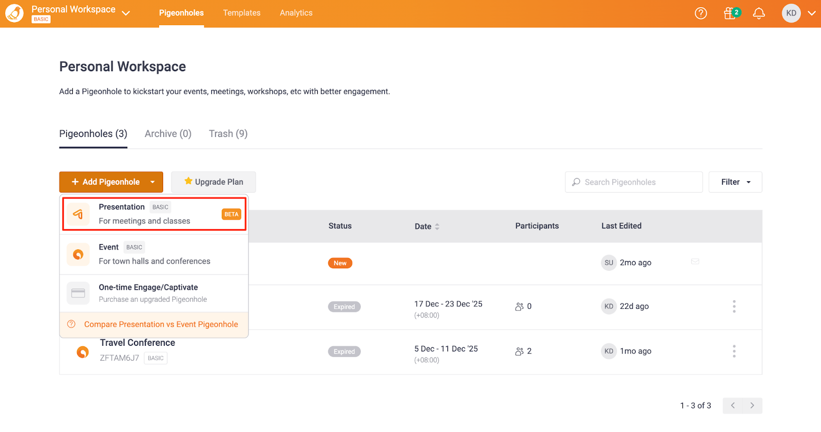 - From your Workspace, select Add Pigeonhole > Presentation.