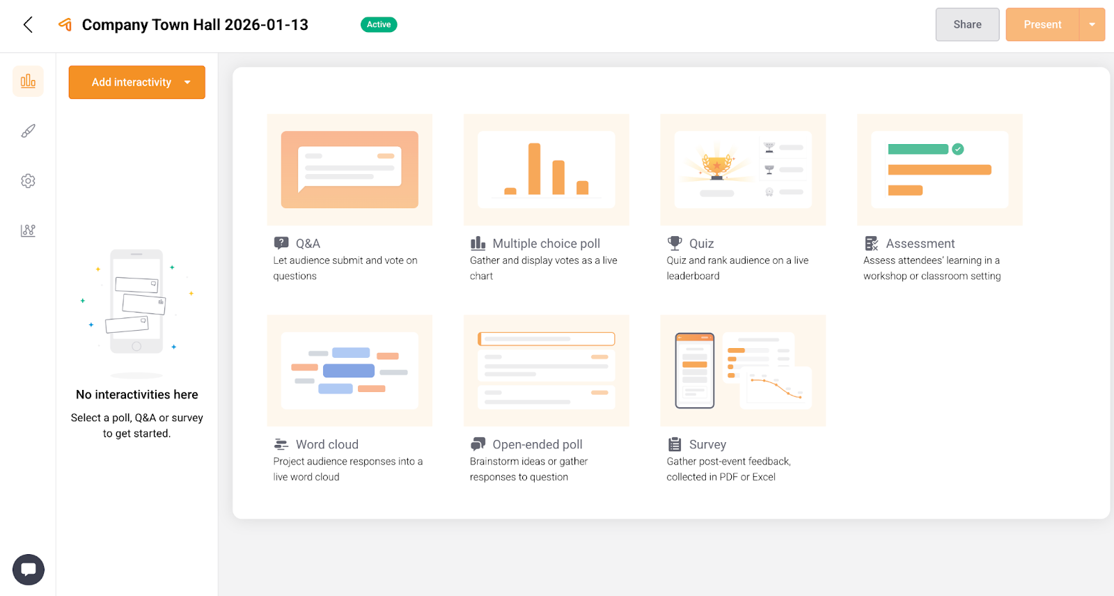 - (Optional) You can hide one or more interactivities from participants until you present them live. For example, you might hide a Quiz or Assessment.